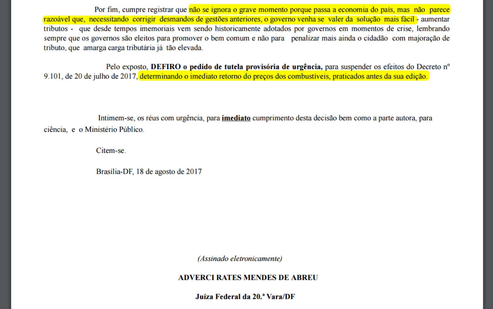 Trecho da decisão da 20ª Vara Federal que suspendeu alta dos impostos sobre combustíveis (Foto: Justiça Federal/Reprodução)