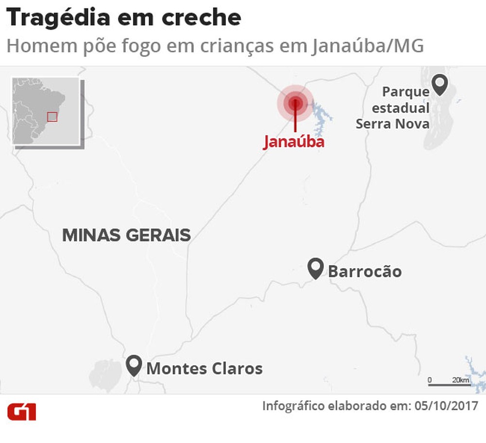 Pelo menos seis crianças morreram queimadas em uma creche em Janaúba, no Norte de Minas, na manhã desta quinta-feira (5). Segundo informações da Polícia Militar e do Corpo de Bombeiros, o guarda do Centro Municipal de Educação Infantil Gente Inocente, no Bairro Rio Novo, jogou álcool em algumas crianças e nele mesmo, em seguida ateou fogo. Ele está no hospital em estado grave.