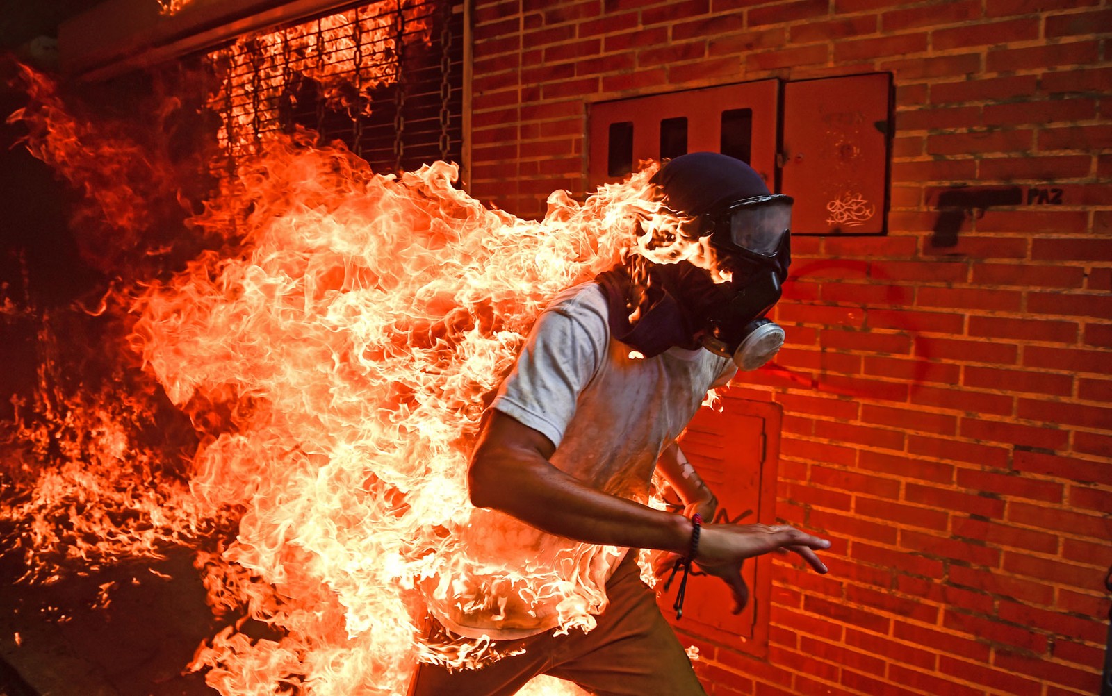 Premiada como a Melhor Foto do Ano pelo prestigioso concurso World Press Photo (WPP), nesta quinta-feira (12), em Amsterdã, a imagem captou o momento em que Víctor Salazar, um estudante de 28 anos, queimava como uma tocha humana, após a explosão do tanque de gasolina de uma motocicleta militar com outros jovens manifestantes em 3 de maio na Praça Altamira, no leste de Caracas.