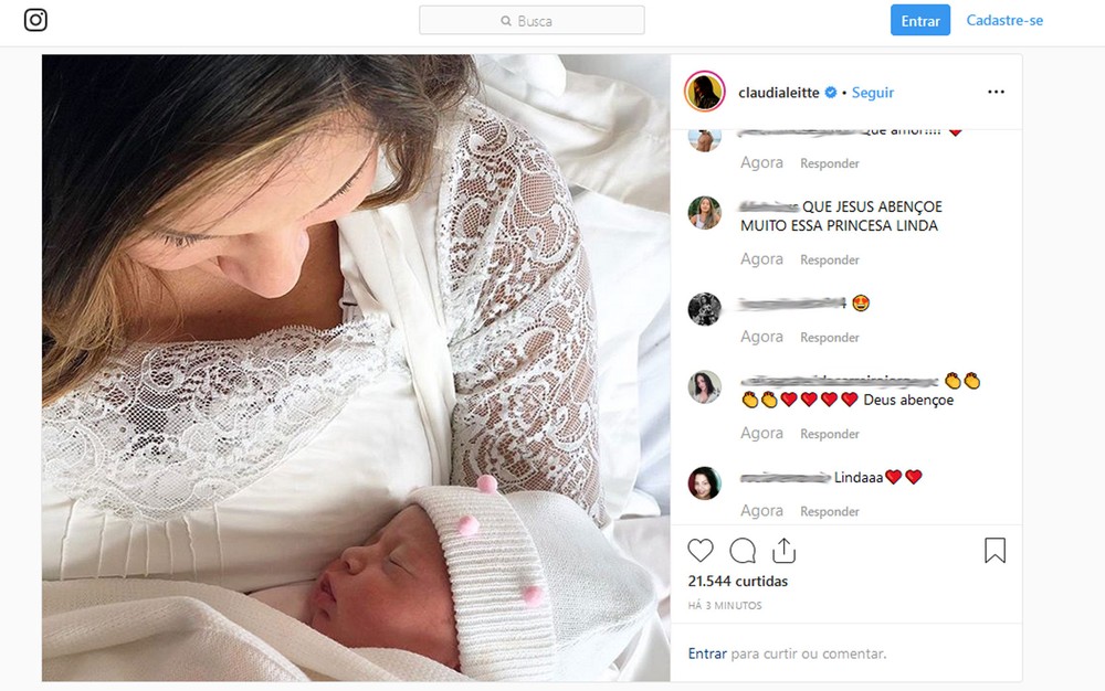 No Instagram, Claudia anunciou discretamente a chegada de Bela, no início da tarde desta terça. “Antes mesmo de te formar no ventre materno, Eu te escolhi; antes que viesses ao mundo, Eu te separei e te designei para a missão de profeta para as nações!” Seja bem-vinda, minha estrela, minha #Bela", disse a artista na legenda de fotos das lembrancinhas que serão dadas a familiares e amigos que vão visitar a bebê.