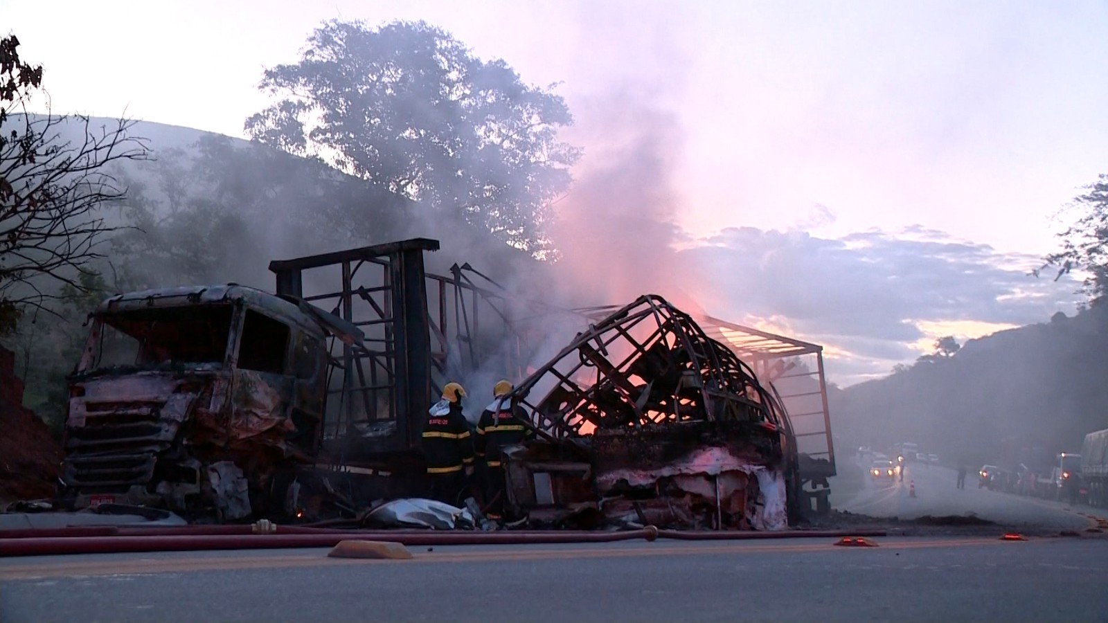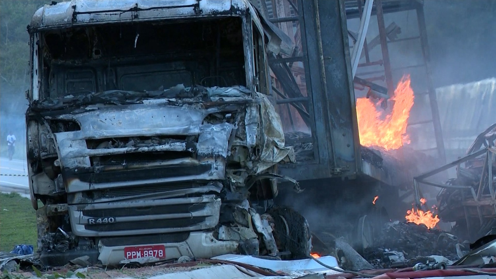 2. O micro-ônibus, após ser atingido, invadiu a contra mão e bateu na carreta com cerveja. Os dois veículos pegaram fogo.